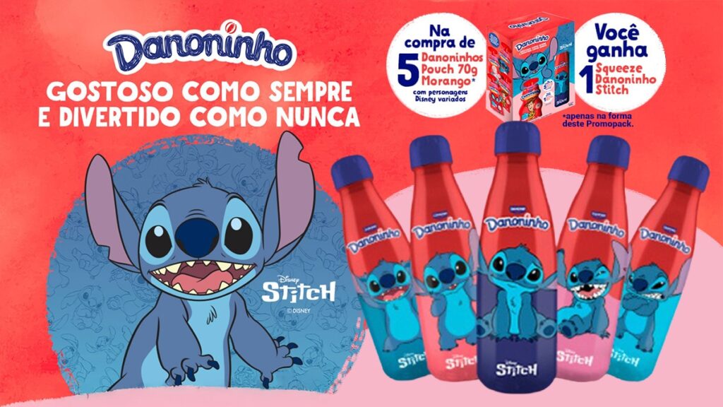 Para garantir um dos cinco squeezes colecionáveis, os consumidores devem adquirir o promopack especial da Danoninho, que traz cinco unidades do Danoninho Pouch Morango de 70g, cada uma acompanhada de um squeeze com Stitch em diferentes poses. A novidade promete encantar não só as crianças, mas também colecionadores fãs do personagem.
