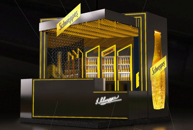 Já a Schweppes investe em sofisticação com um bar instagramável e uma garrafa de bolhas gigante que virou ponto de encontro e foto obrigatória.