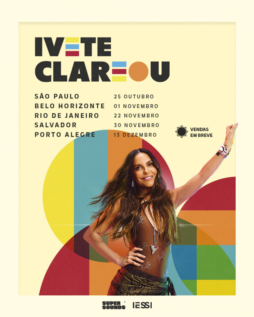 Ivete Sangalo vai clarear o Brasil com muito samba no pé e no coração. A cantora acaba de anunciar sua nova turnê “99 apresenta: Ivete Clareou”, projeto inédito que celebra sua relação antiga e afetuosa com o samba. A estreia está marcada para o dia 25 de outubro, em São Paulo, e vai passar ainda por Belo Horizonte (01/11), Rio de Janeiro (22/11), Salvador (30/11) e Porto Alegre (13/12). Os ingressos estarão disponíveis a partir do dia 8 de julho, no site da Ingresse.
