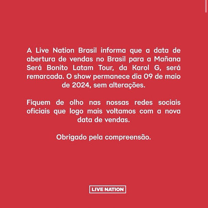 Prevista para começar no dia 5 de outubro, a Live Nation comunicou nas redes sociais que a abertura das vendas será remarcada, no entanto, a data do show está mantida.