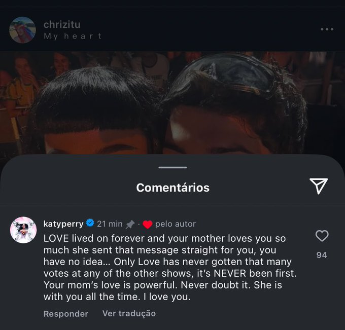 Após o encontro, Katy deixou uma mensagem no perfil de Christian no Instagram. “O amor da sua mãe é poderoso. Nunca duvide disso. Ela está com você o tempo todo. Eu te amo”, escreveu.