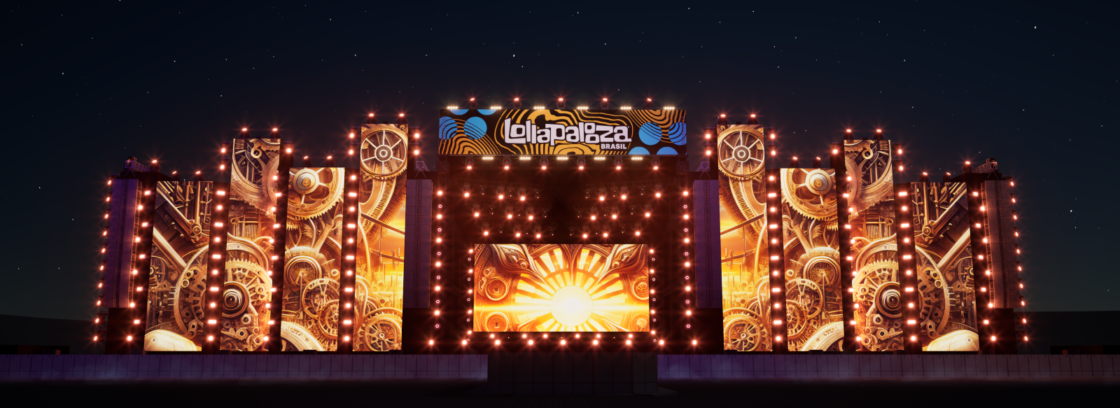 Além da iluminação de última geração, o Palco Perry impressiona pelo tamanho: são 57 metros de largura por 18 metros de altura, garantindo um espetáculo visual impactante logo na entrada do festival.