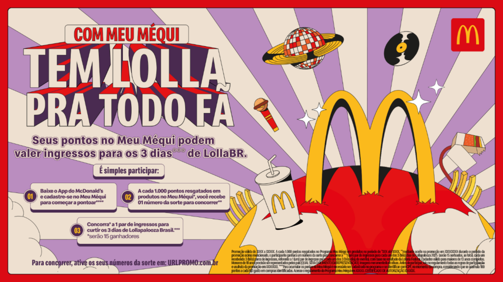 O Lollapalooza Brasil 2025 está chegando e, para celebrar a parceria como patrocinador oficial do festival, o McDonald’s lançou a promoção “Com Meu Méqui tem LollaBR pra todo fã”, oferecendo a oportunidade de levar 15 clientes sortudos (e seus acompanhantes) para viver a experiência do festival.